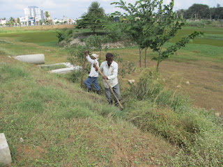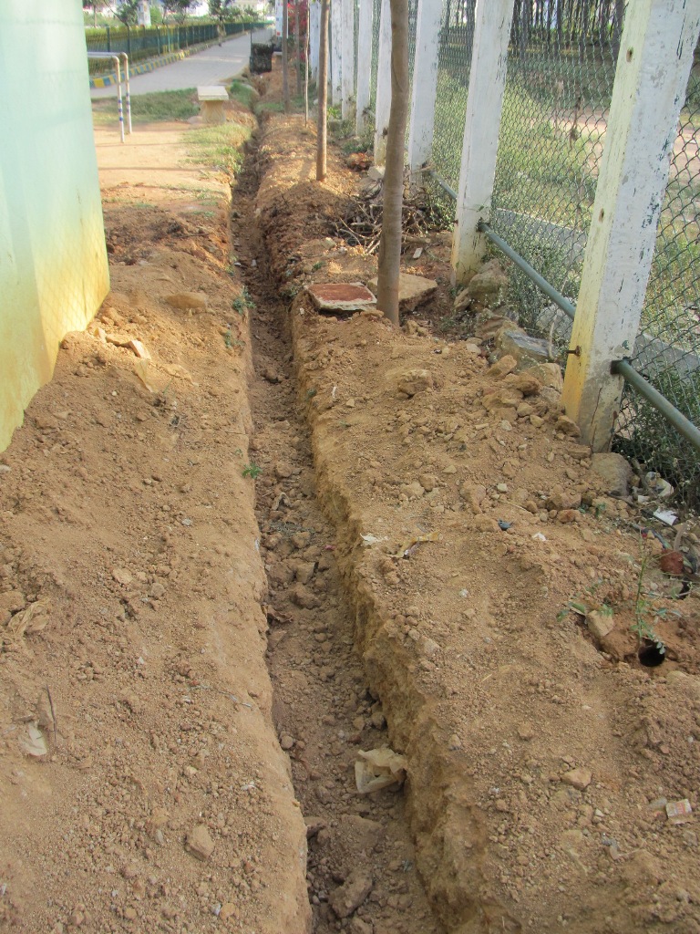 While waiting for the Diversion Channel pipes to arrive, the contractor got his men to start digging a trench and laying an Irrigation Pipeline all around the lake to facilitate watering the plants. At present we get water tankers to fill the tanks and the gardeners use the wheel barrow to ferry filled buckets to water our 320 trees, many shrubs and other plants. A laborious task to say the least not to mention an expensive one. The bore wells around the lake are recharged thanks to the lake but the well operators do not reduce their charge one bit! The Irrigation Pipeline will enable us to plant two more rows of trees on the slope, countless small flowering plants between trees on the embankment, shrubs, creepers, climbers and what have you to give ourselves a green nice cover in the neighbourhood.