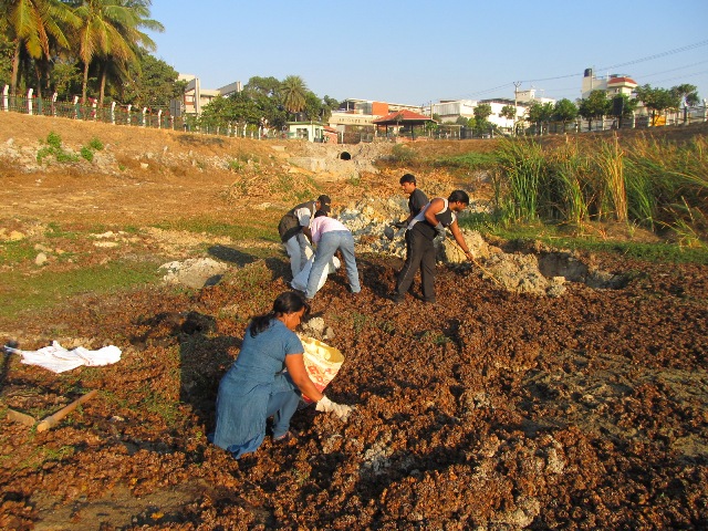 Their enthusiasm was infectious and several people stopped jogging/walking to see what they were doing, then joined them to remove the drying Salvinia Molesta. Working with a rake, a spade or simply scooping up the weed with bare hands, they filled plastic bags, formed a line on the slope, handed each bag over the grill where others waited to cart them away. The dry Salvinia can be used for mulching or composting. We have opted to compost them by laying them along the boundary fence.