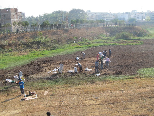 Despite working hard for over two hours, only a patch of ground has been cleared. With more of you joining us tomorrow (and on subsequent weekends) we should be able to accomplish our mission of clearing the lake bed and getting it ready for the monsoon.
