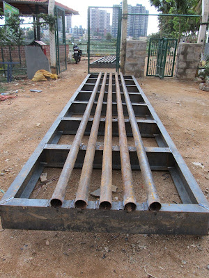 Visitors would have seen the enormous iron frame that was getting assembled on the ground between the security cabin and the gazebo. Thick iron rods have been placed over the frame to make a cow-catcher-like grill. This grill will replace the concrete slabs below the Brigade Millennium arch. Each of the slabs has two or three holes which do not permit much of the rain water to enter the trench below. Hence, rain water all these days was washing down the road like a stream. Now the grill will accept most, if not all, the surface water, and channel it into the lake. Consequently, the level at the lake will increase several times while preventing wastage of precious rain water.