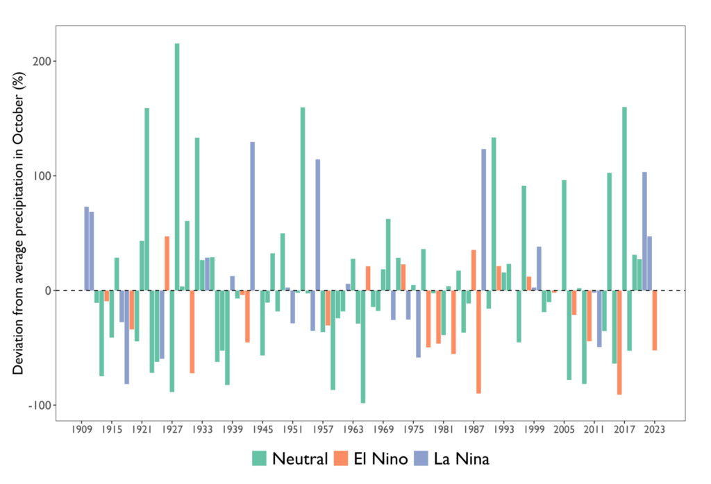 The impacts of La Nina and El Nino are most clear in October. Rainfall in October appears to be consistently less than average during El Nino years and consistently more than average during La Nina years.