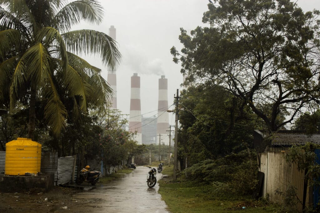 The chimneys of the NTECL Vallur Thermal Power Station, billowing smoke, loom over Kuruvimedu in Ponneri, Thiruvallur near Chennai. Wedged between the plant and its sprawling 300-acre ash pond, the hamlet lies under a blanket of kari (coal) and sambal (ash), coating its narrow streets, colourful homes, and trees.