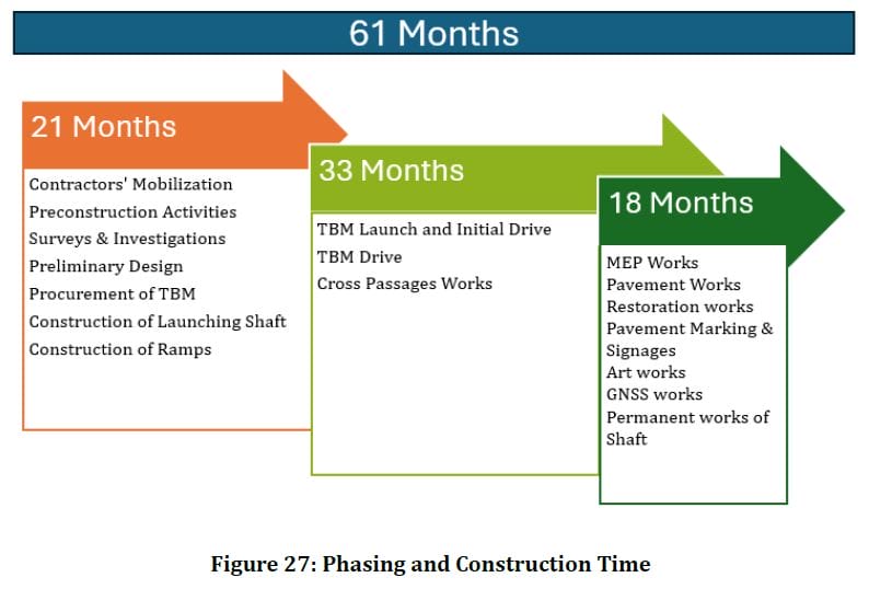 The initial cost estimate for the 18 km Hebbal–CSB Tunnel is Rs 15,000 crore with a completion timeline of five years. However, on 28th January 2025, the Deputy Chief Minister emphasised GoK’s commitment to the project and set a new deadline of three years. These estimates and targets appear to be unrealistic and are more likely to be closer to Rs. 30,000 Crores and 10 years.