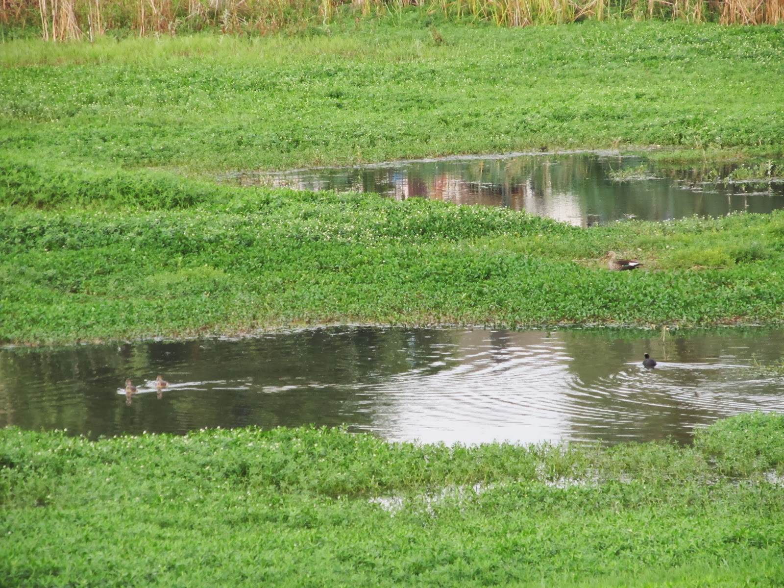 Spot-billed ducklings (left, in the water), Coot (right, in the water), parents (right, on the grass),