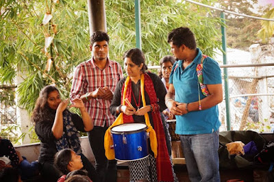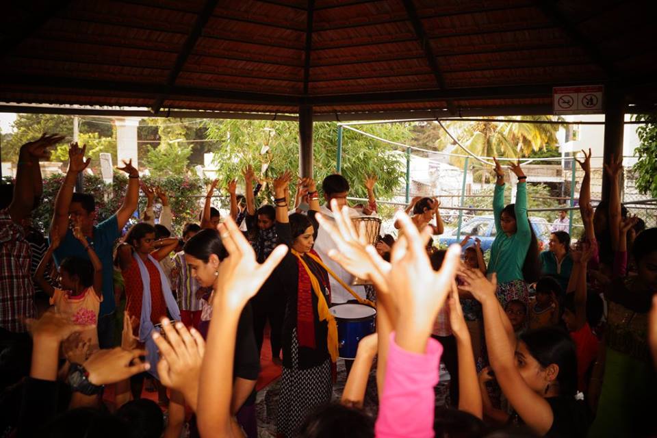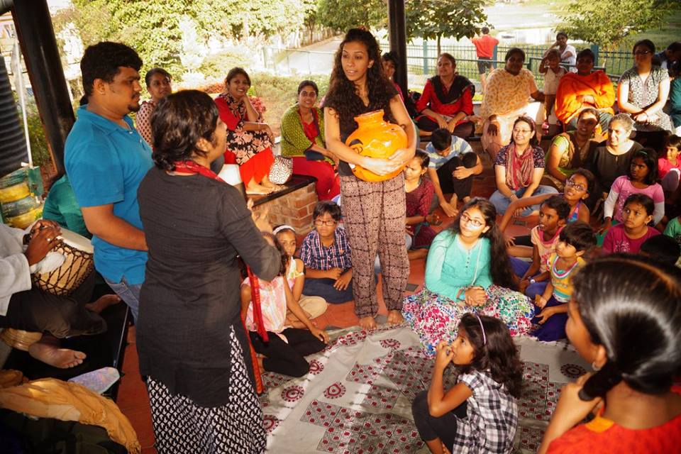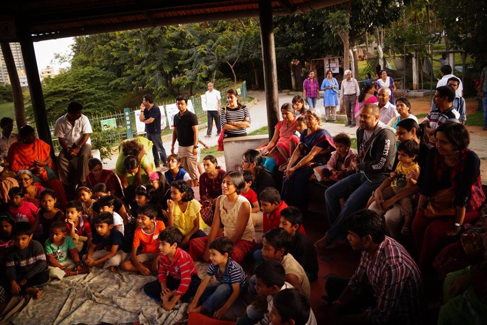 Thank god it didn’t rain! We never thought we would say this but it was important that the early evening of Sat. 12th Sept remained nice and dry. “Keshavraju Thippaswamy” wanted a drum above everything else. Would he get it was the question in the minds of the 30 odd children who had gathered in the Gazebo at the Puttenahalli Lake in South Bengaluru. The occasion was a celebration, though a little delayed, of International Literacy Day with a story telling by Geetu and team from the Snehadhara Foundation in an event organized by PNLIT. As part of its One Day One Story campaign, Pratham Books had chosen the engaging tale of “The Boy and his drum” written by Umesh P N and illustrated by Rajiv Eipe.