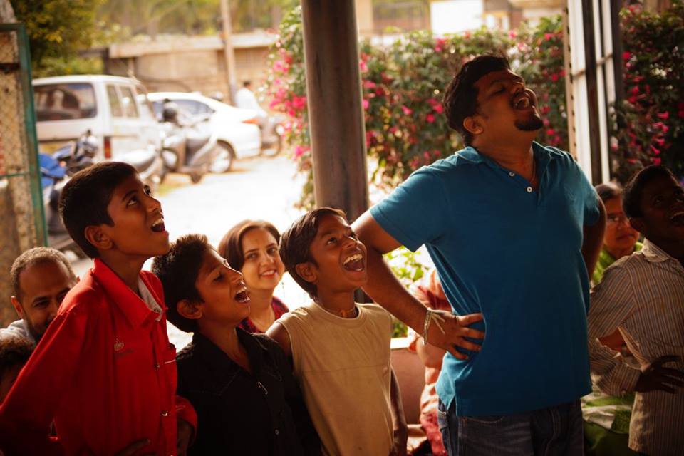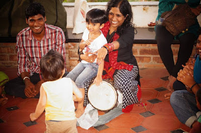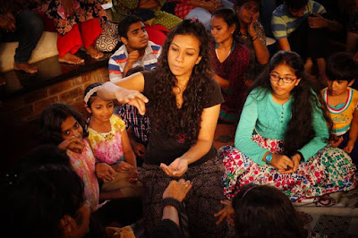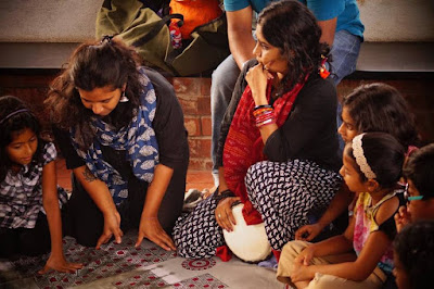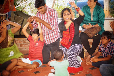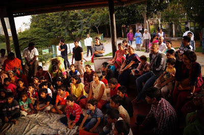 Together with the Snehadhara team, PNLIT trustees and volunteers hung banners, spread durries on the floor and completed the arrangements for the fun to begin at 4.30 p.m.  But where were the kids? Except for the organizers’ children, there were hardly any others! Once Geetu began the narration, however, children from the neighbourhood flocked in, their feet gathering speed when they heard the clapping, singing and loud laughter from the Gazebo.
