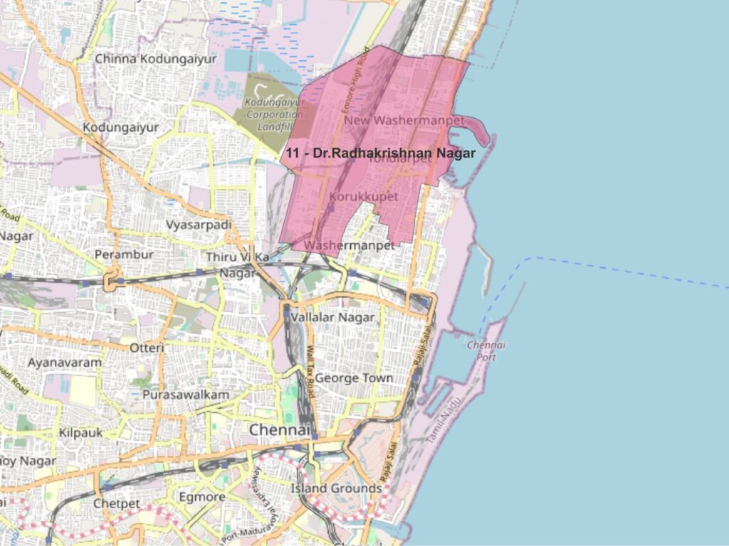 Dr. Radhakrishnan Nagar, commonly known as RK Nagar, is an assembly constituency located in the northern coastal part of Chennai. The area is characterised by fisher community settlements, port-linked labour colonies and informal housing clusters. The population depends highly on welfare delivery systems.
