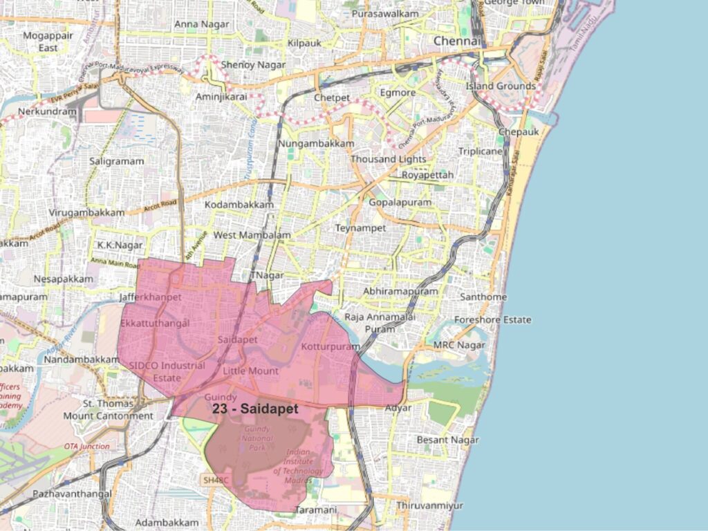 Saidapet Assembly Constituency is part of the Chennai South parliamentary seat. It includes key areas such as Guindy, Kotturpuram, Nandanam, and Jafferkhanpet.