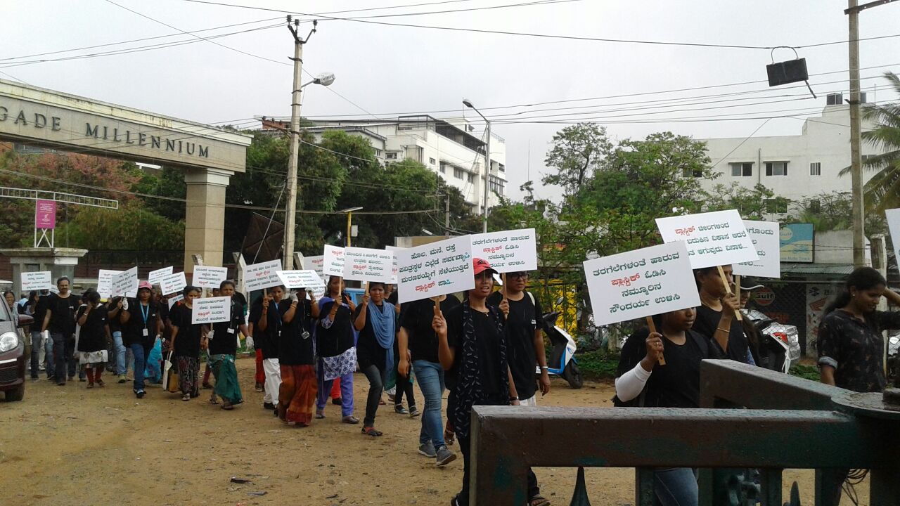 The EMPRI office at Doresanipalya Forest Campus was abuzz from 8 a.m. on Tuesday, 14th March 2017. EMPRI staff, researchers, citizen activists, representatives from BBMP, Hasiru Dala, workers and rag pickers, all wearing black Tee shirts waited for the signal to start off a procession. The message was simple but vital – Say no to Plastic.