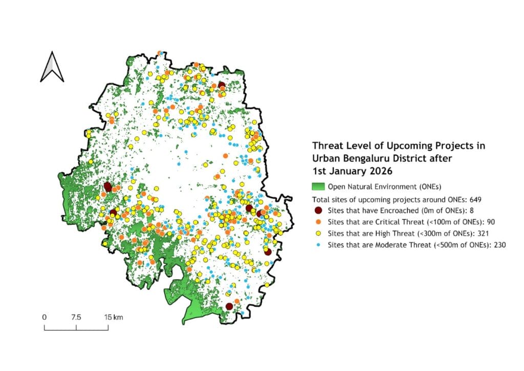 Of the 3,897 projects, 1,206 were classified as scheduled for completion after January 2026 — effectively representing the city’s upcoming built footprint. At a macro level, a taluk-wise heatmap shows that development pressure is concentrated in Bengaluru East, Bengaluru South, and Anekal — precisely the zones where large, contiguous ONE patches still exist. At a micro-level, buffer analysis around ONEs was undertaken to understand inherent threats to ecology due to proximity of construction – on a gradient from direct encroachment to minimal risk beyond 500 metres.