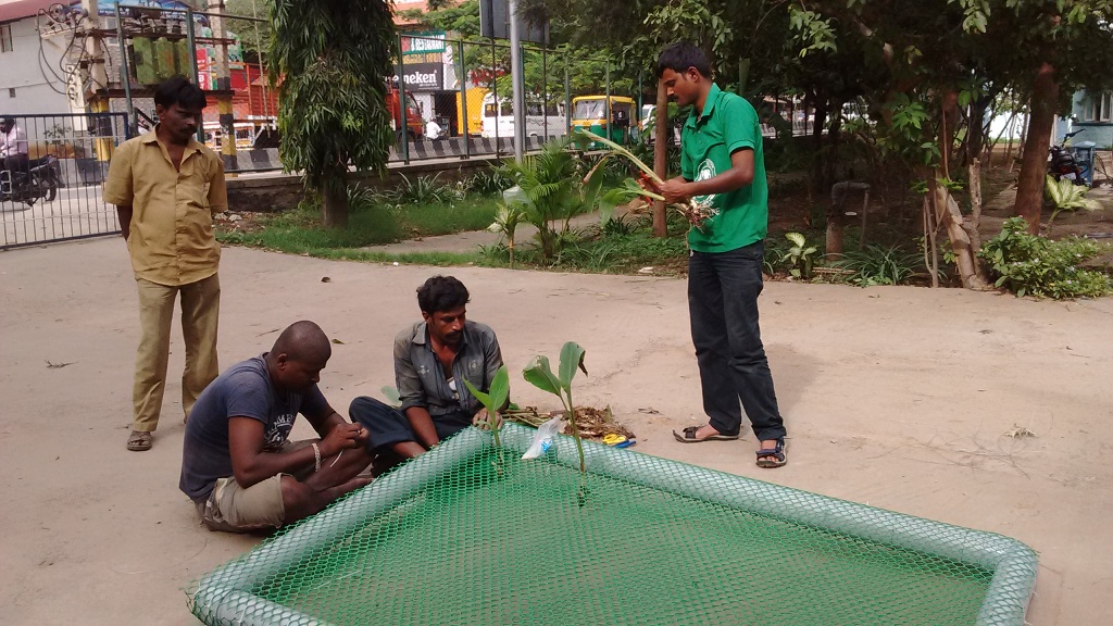 On 23rd August, we went with our gardener, Jayanna, to Madiwala Lake and showed them how to make a prototype, inserted canna bulbs and finally floated it in the water. I don’t know who was more thrilled – KLCDA officers, their gardeners or our PNLIT team!