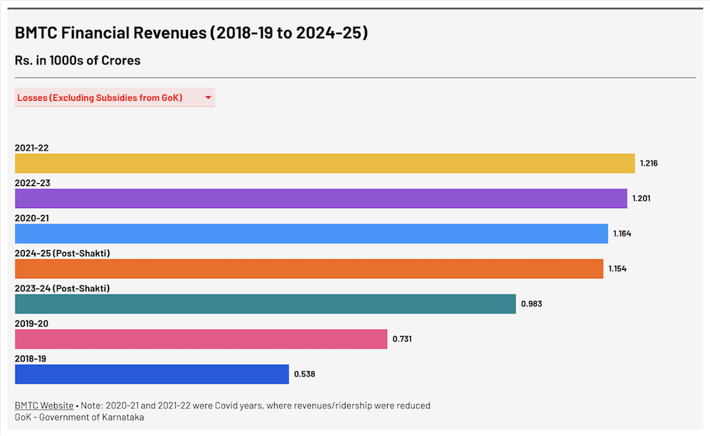 The analysis found that after excluding financial assistance from the Karnataka government, BMTC continues to report losses similar to those it incurred between 2020 and 2023, before the introduction of the Shakti scheme. In fact, traffic revenue and passenger ridership have returned to pre-COVID levels since the scheme was launched.